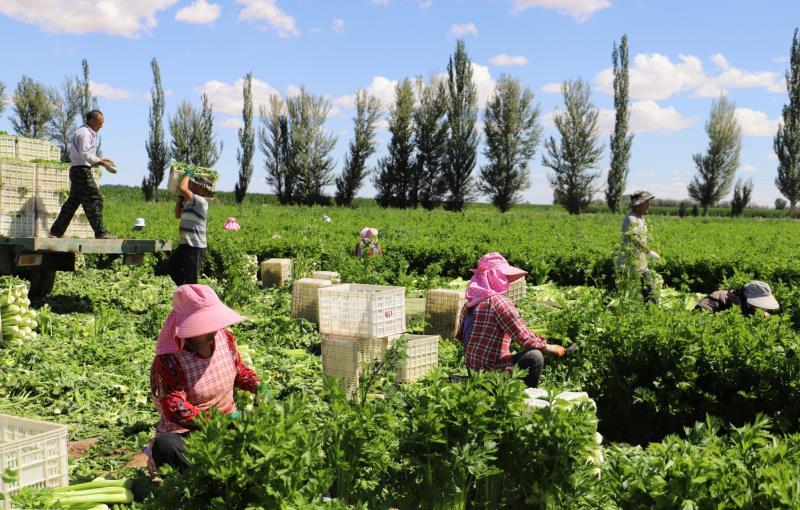 菜农们正在采收西芹。辛乐 摄今年,民勤县昌宁镇依托毗邻金昌市粤港澳大湾区“菜篮子”基地的区位优势,落实落细“3+1”主导产业,通过招商引资、龙头企业带动等方式,大力推行“龙头企业+基地+农户”的经营模式,建成了以西芹为主的特色蔬菜种植示范点1000亩,通过示范引领、以点促面,带动周边种植以甜美南瓜、娃娃菜为主的特色蔬菜400余亩。