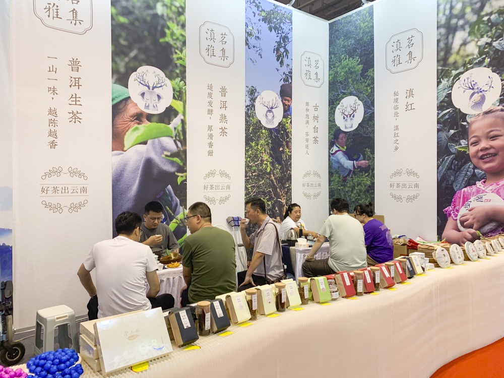 来自云南临沧的参展茶商滇茗雅集带来数十款古树普洱茶。 图片来源:信网茶博会以茶、器、艺、水四大主题,展会现场除设茶叶展区,集中展示优质精品茶品以外,还设有茶具展区、陶瓷展区、紫砂展区、工艺品展区、书画展区、红木展区、沉香展区、台湾展区、茶文化展区、高端饮用水展区、崂山十二大茗茶展区、文创展区等。