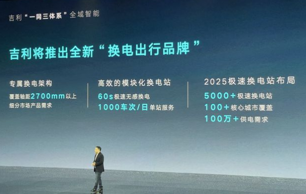 同时,吉利在"换电架构、换电站、换电车辆"领域已经拥有上千项技术专利,还将推出全新"换电出行品牌"。到2025年,实现100个核心城市布局5000座极速换电站,满足100万辆车的换电需求。
