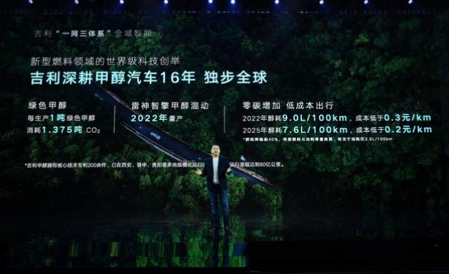 值得一提的是,吉利在新型燃料领域深耕甲醇汽车16年,已经在甲醇能源领域独步全球,拥有核心技术专利200余件,在西安、晋中、贵阳等多地规模化运行2.7万辆,总运行里程达到80亿公里。2022年,吉利将推出“雷神智擎甲醇混动“车型,百公里醇耗在9L左右,醇耗降幅超40%,每公里的出行成本低于三毛钱。到2025年,百公里醇耗将降到7.6L,相当于百公里油耗3.5L,每公里的出行成本两毛钱,生命周期内零碳增加,更环保。