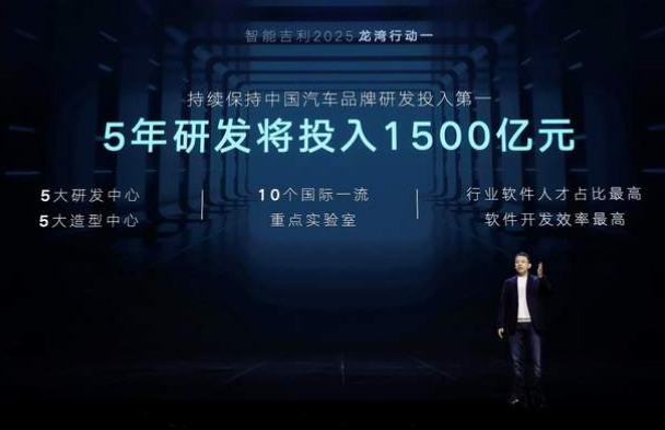 龙湾行动一:吉利将持续保持中国汽车品牌研发投入第一,5年内研发将投入1500亿元。依托吉利全球“5大研发+5大造型中心”构建全球领先的国际化研发体系,全面向智能时代转型,到2025年,实现行业软件人才占比最高,软件开发效率最高。深耕基础科学领域研究,打造10个国际一流的重点实验室,加速科技成果转化落地,持续保持吉利核心技术领先。