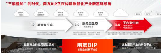 用友于1988年成立至今,经历了 IT在企业应用的三个大阶段:一是计算机化阶段,电脑做的是财务软件,做到市场第一;二是 ERP阶段,做到亚洲第一,全球前十;三是数智化阶段,这个阶段是企业云服务,核心产品是 BIP。