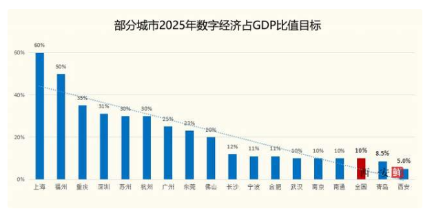 无独有偶,在赛迪顾问最新发布的“2021年中国数字经济城市百强榜”排名中,西安下滑两名,被合肥和宁波超越,而这两座城市未来五年将数字经济占地区生产总值比重11%作为发展目标,并写进了本地的“十四五”规划。