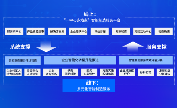 “智能制造服务平台”以智能制造供需对接、服务为核心,构建“一中心多站点”平台体系,为智能制造服务商、企业、专家等主体开展资源推介、评估诊断、对接交流等智能制造活动提供支撑平台和便捷工具。