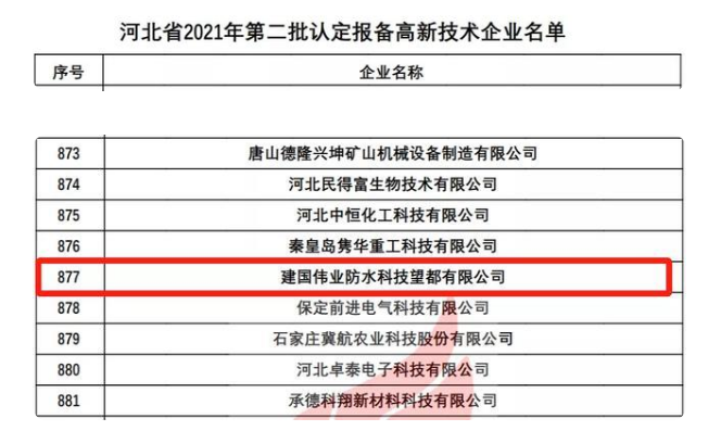 日前,高新技术企业认定管理工作网发布了关于公示河北省2021年第二批认定报备高新技术企业名单的通知。高新技术企业认定管理工作网称,根据《高新技术企业认定管理办法》(国科发火〔2016〕32号)和《高新技术企业认定管理工作指引》(国科发火〔2016〕195号)有关规定,本次共有1294家企业通过了此次河北省2021年第二批认定报备。其中,建国伟业防水科技望都有限公司成功通过了高新技术企业复审。