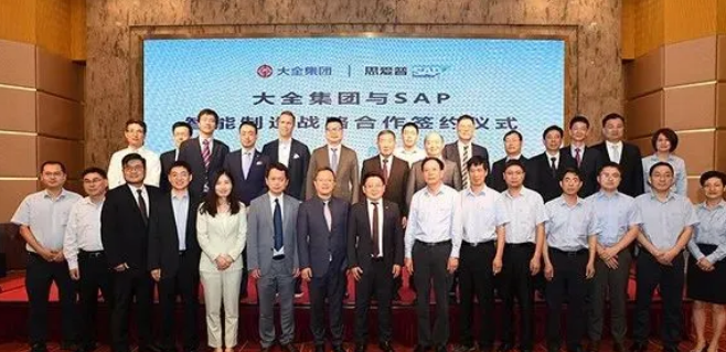 6月29日,大全集团与思爱普(SAP)举行战略合作签约仪式。双方进一步深化合作,大全集团将借助SAP高度集成的端到端智能制造整体解决方案,加速企业标准化建设,全面推进产品智能化、生产自动化、管理信息化、服务网络化,实现“数字化制造到智能制造”的企业全面转型升级。