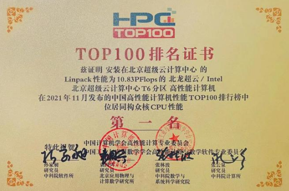 此次入围中国HPC TOP100排行榜三套超算系统分别是:北京超级云计算中心T6分区、A6分区、A分区,其中北京超级云计算中心T6分区以Linpack性能10.83PFlops荣获通用CPU算力性能(同构众核CPU性能)第一名。