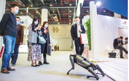 11月20日,参观者在“5G+工业互联网成果展”现场与仿真机器狗互动。