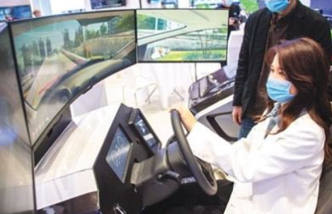 11月19日,参观者在“5G+工业互联网成果展”上体验驾驶智能模拟器。