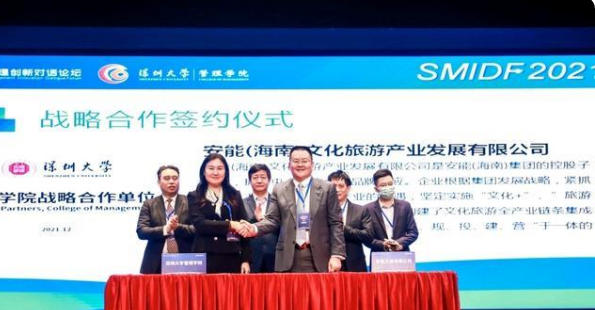 在特别环节中,深圳大学管理学院与深圳市万人市场调查股份有限公司、安能(海南)文化旅游产业发展有限公司进行合作签约并举行了揭牌仪式。