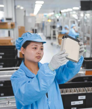 科远智能工厂检测员对智能化生产线的产品进行人工抽查。