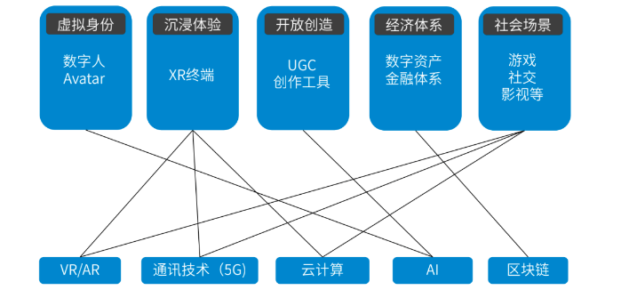 这与元宇宙的构成不谋而合。根据陀螺研究院发布的《5G时代内容平台和流量高地——Metaverse元宇宙研究报告》,其中提到,元宇宙的出现和发展依靠一系列技术的加持,VR/AR、通讯技术、云计算、AI和区块链是元宇宙的五大关键技术,决定了元宇宙能否顺利发展和成长。