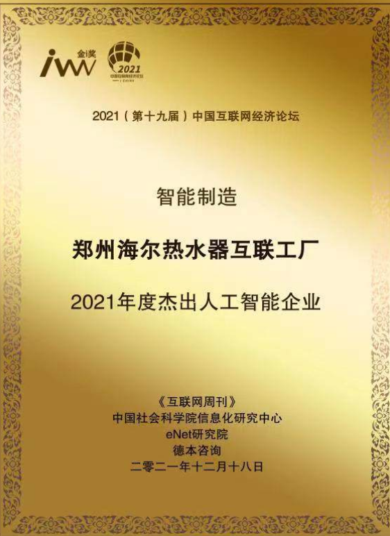 凭借在AI方面的创新应用,海尔郑州热水器互联工厂荣获“ 2021 年度杰出人工智能企业”奖项。主办方认为,海尔郑州热水器互联工厂将工业核心技术与先进制造技术深度融合,实现端到端的智能制造,引领国内热水器互联工厂的制造规模和水平。