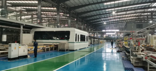 该车间于2020年7月正式动工。今年,恰逢蒙娜丽莎集团上市四周年,代表着世界陶瓷板材制造尖端水平的蒙娜丽莎特高板数字化示范车间正式投用,引领中国建陶产业走在“数字化、智能化、绿色化”的世界前列;车间里的三条生产线数控装备占有率超过90%,自动化水平达到90%,高智能化使传统陶瓷生产线生产力“脱胎换骨”,现已实现高度自动化、绿色化生产和整个生产过程的能源监控与改善。