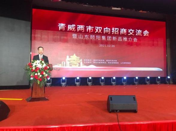 2021年12月26日上午,青岛市威海商会在黄海饭店会议中心举行青威两市双向招商交流会暨山东颐阳集团新品推介会。青岛市商务局二级巡视员郭建、威海市商务局副局长邓卫等领导出席交流会并发表讲话,青岛市威海商会会长曲涛、执行会长郑文涛、常务副会长兼秘书长姜洪涛、常务副会长兼党支部书记刘民忠、常务副会长梁德伟、张华,副会长毕可君、杨军、刘华龙、隋鹏飞、徐林军、曲华东及监事长蔡秉芬等威海商会的代表,各友好商协会、山东颐阳集团的代表及新闻媒体等方面的朋友,共计120余人参加了活动。青岛市威海商会曲涛会长、山东颐阳集团于海先董事长先后在交流会上致辞。活动期间,山东颐阳集团进行企业介绍和新产品推介。