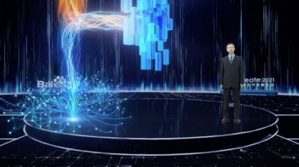 在百度Create 2021大会上,百度首席技术官王海峰便现场展示了百度的知识增强大模型的跨模态理解与生成能力,王海峰在现场说了一句:“百度大脑,我们一起创作一幅水墨画吧。这边是连绵的山脉,山上云雾缭绕,山脚下有一座草堂建在江边,江上有 一条船,一个人站在船头;然后这边有一行飞鸟掠过天空。”百度大脑即刻便将王海峰语言文字的描述转换为一幅颇有意境的中国画来展现。