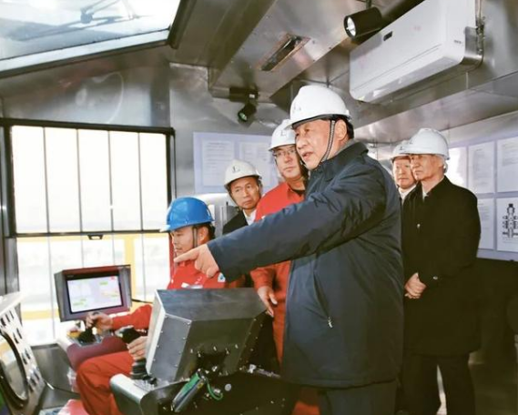2021年10月22日下午,中共中央总书记、国家主席、中央军委主席习近平在山东省济南市主持召开深入推动黄河流域生态保护和高质量发展座谈会并发表重要讲话。这是座谈会前,习近平21日下午在位于东营市莱州湾的胜利油田莱113区块考察时,登上二层钻井平台,察看钻井自动化设备。 新华社记者 李学仁/摄