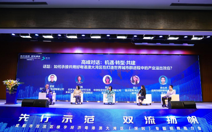 高峰对话环节,邀请深圳市人才集团有限公司总经理翟斌、北京大学深圳研究生院未来产业技术研究院副院长赵柯禹、深圳市中洲投资控股股份有限公司监事会主席陈玲、盘古智库湾区研究院秘书长高山、遨博华南创新技术研究院院长余任冲5位产业研究院及智库专家,就东西部产业人才互动,承接用好粤港澳大湾区在打造世界城市群进程中的产业溢出效应开展了一场精彩绝伦的交流探讨。专家们一致认为,人才培养至关重要,人才聚集起来是城市发展的根本。不同领域的人才都需要施展才华的平台,要健全人才政策制定,宣传好人才工作,营造爱才惜才的浓厚氛围。