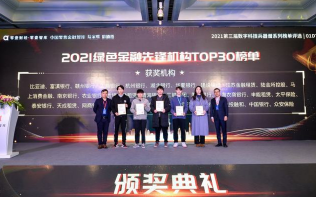 这是零壹财经·零壹智库首次推出的绿色金融类评选,工商银行、农业银行、中国银行、建设银行、江苏金融租赁、陆金所控股、马上消费金融、三峡集团、厦门银行、上海农商银行、申能租赁、太平保险、比亚迪、赣州银行、网商银行、兴业银行、银河资产、长城国兴、浙江民泰银行、众安保险等30家绿色金融服务机构上榜。